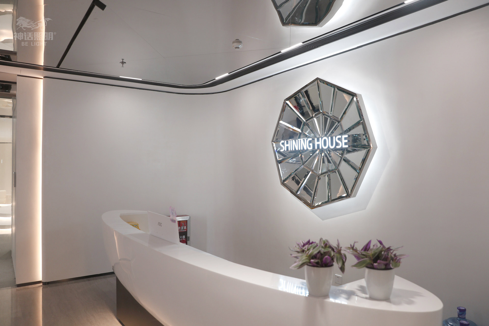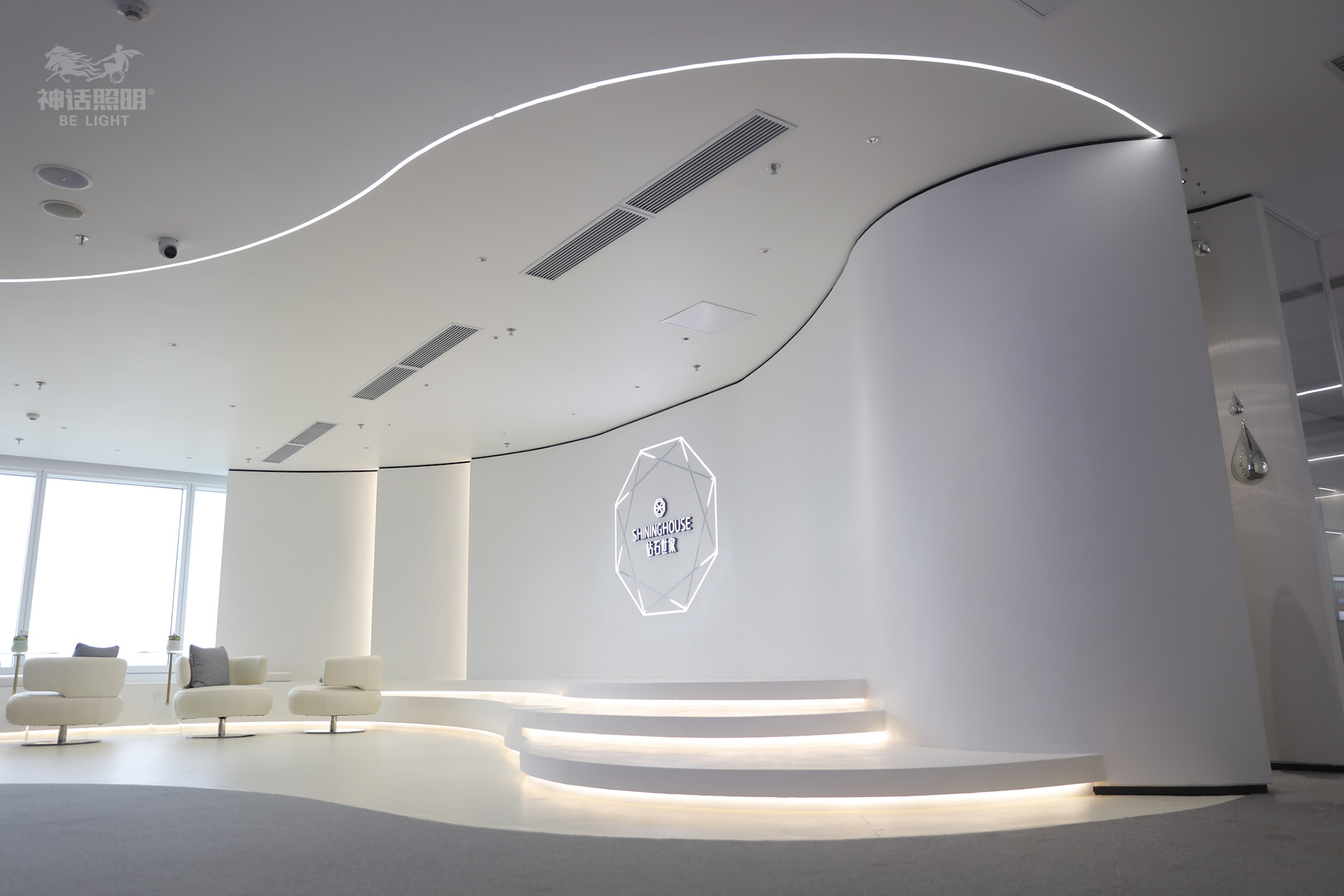 令人印象深刻的会是那颗代表公司和品牌形象硕大无比、光芒四射的钻石LOGO,哦它是可以转动的!背光散出光晕、主光照亮钻面不同的折射光分外显气质,磁吸线性格栅灯均匀的照亮前台台面,简洁有效的灯光手法效果就是那么好。