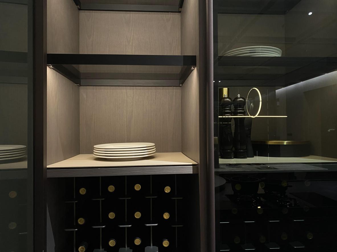 透光的柜内背板让人惊艳 ,除了柔和均匀的透光,选材和装饰氛围也注意到了,在此情此景下小酌一杯,便是令人期待的场景。